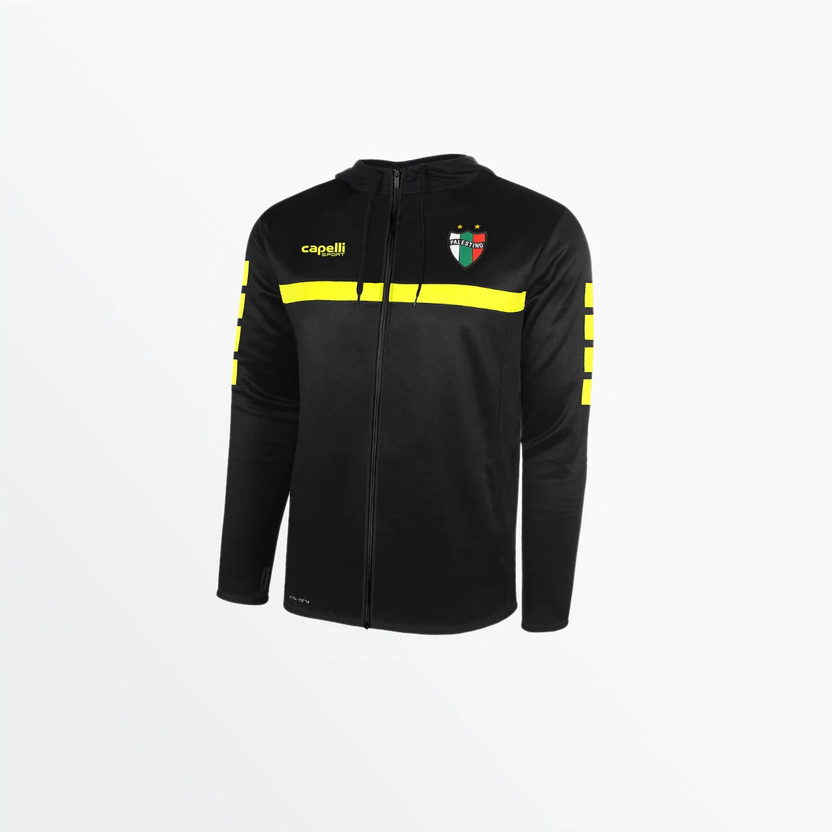 Palestino fans can show their spirit with the Sparrow Palestino Hooded Training Jacket. The jacket has mesh side panels and arm vent holes to keep you cool while working your hardest. The elastic on the collar and sleeve openings keep you locked in through all of your movements. The training jacket comes with the Sparrow training line signature stripe and Palestino crest embroidered on the chest.